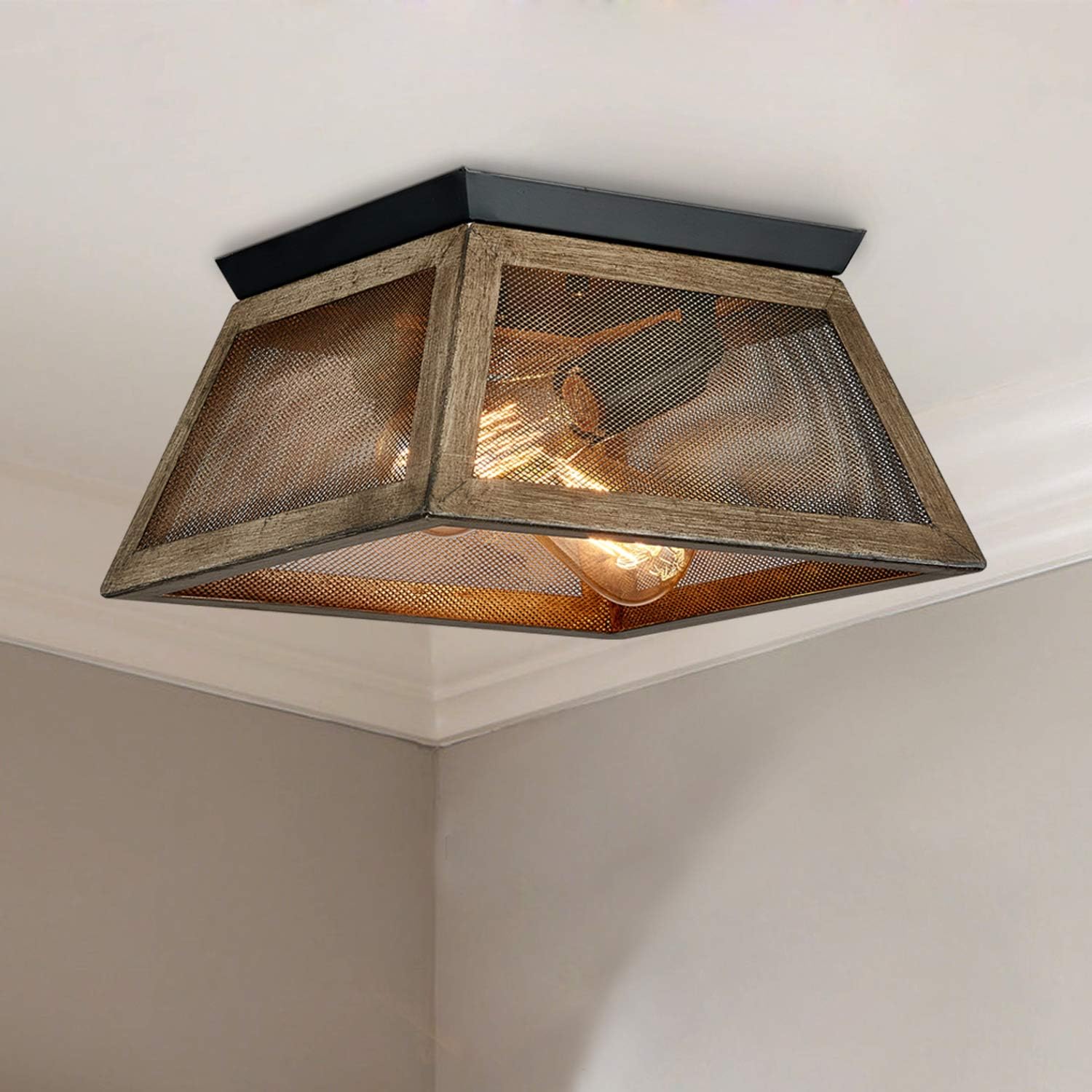 - This flush mount ceiling light painted okay Wood-look on metal frame paired with an antique bronze finish top and stardust distressed network lampshade, which is suitable for barn or farmhouse style space. This rustic farmhouse vintage industrial country island light from mossinal collection is perfectly designed to illuminate your space whether for hallway, living room, foyer or wide variety of dry locations!