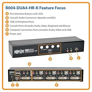 The B004-DUA4-HR-K is a 4-Port DVI/USB KVM Switch with audio and USB 2.0 peripheral sharing. It allows you to access, control, boot and reboot four computers from a single USB keyboard, USB mouse, and monitor. Switching between connected computers is quick and simple using keyboard hotkeys or pushbuttons. An independent audio/mic and USB peripheral switching function allows for an uninterrupted experience. A computer can be printing on a printer connected to one of the USB 2.0 peripheral ports, while you listen to audio from and access another computer; all at the same time.