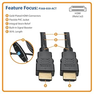 The P568-050-ACT Active High-Speed HDMI Cable (M/M) connects a computer, cable box or Blu-ray source to a high-definition monitor, projector or television up to 50 feet away. Its built-in signal booster allows a clean audio/video transmission without the effort and expense of adding an external repeater to your HDMI cable run. Plus, a built-in equalization control lets you manually adjust the display image to your liking.
